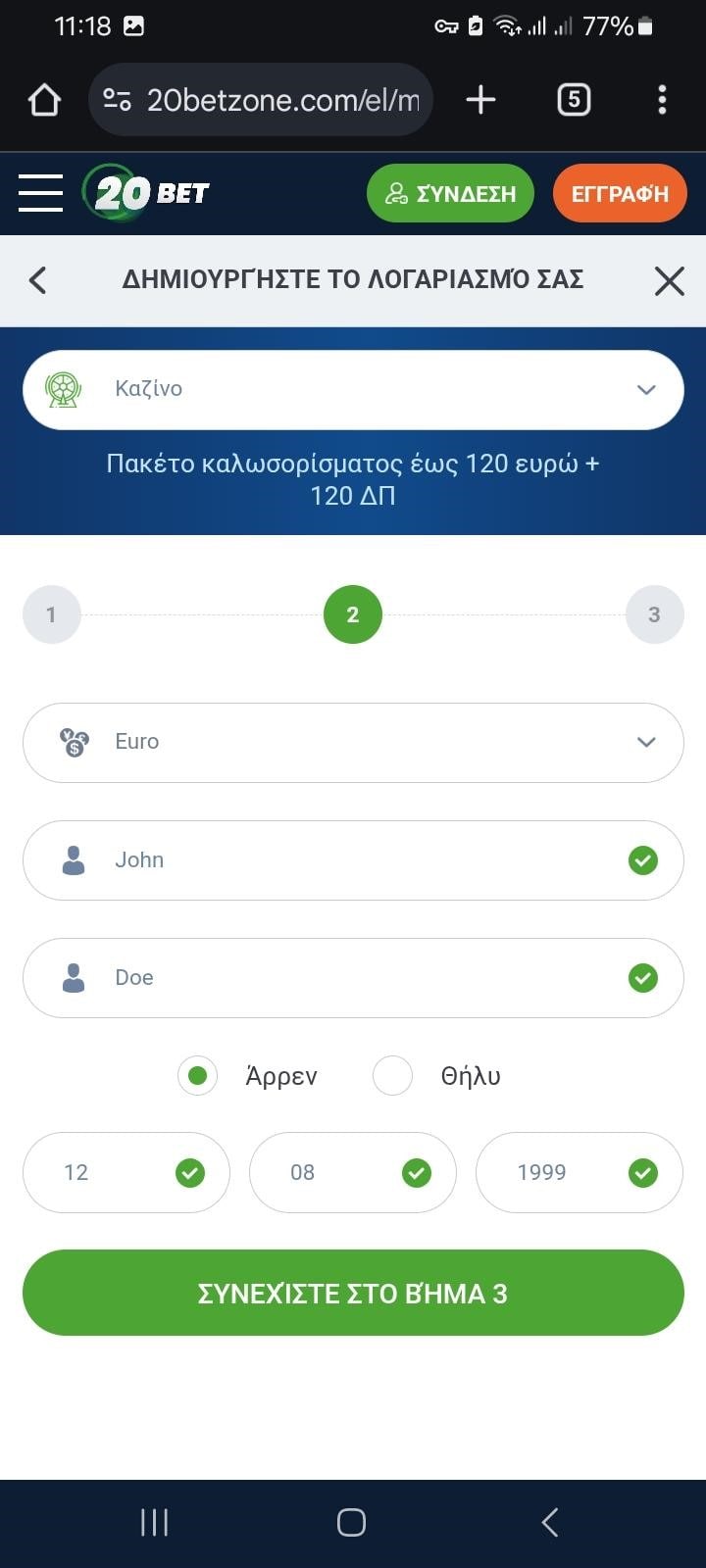 Για να ξεκινήσετε να χρησιμοποιείτε το 20Bet, πρέπει να ολοκληρώσετε την τυπική διαδικασία εγγραφής. Σε αντίθεση με ορισμένες άλλες πλατφόρμες που προσφέρουν εγγραφή με ένα κλικ ή μέσω κοινωνικών δικτύων, το 20Bet προσφέρει μία μόνο – πλήρη – μέθοδο δημιουργίας λογαριασμού. Αυτό σημαίνει ότι πρέπει να εισαγάγετε όλα τα απαραίτητα προσωπικά στοιχεία από την αρχή. Η διαδικασία περιλαμβάνει διάφορα στάδια: