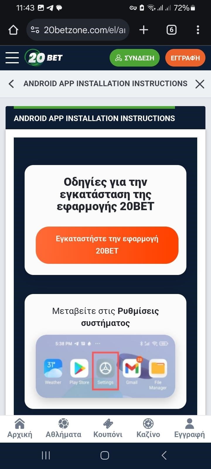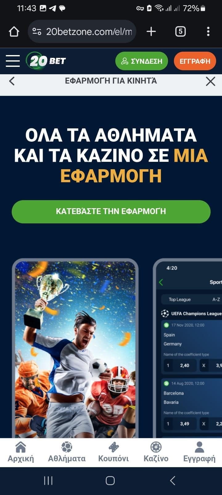 Για παίκτες που προτιμούν να στοιχηματίζουν μέσω κινητού, το 20Bet προσφέρει μια πλήρως λειτουργική εφαρμογή για Android. Η λήψη της είναι διαθέσιμη απευθείας από την επίσημη ιστοσελίδα του bookmaker.