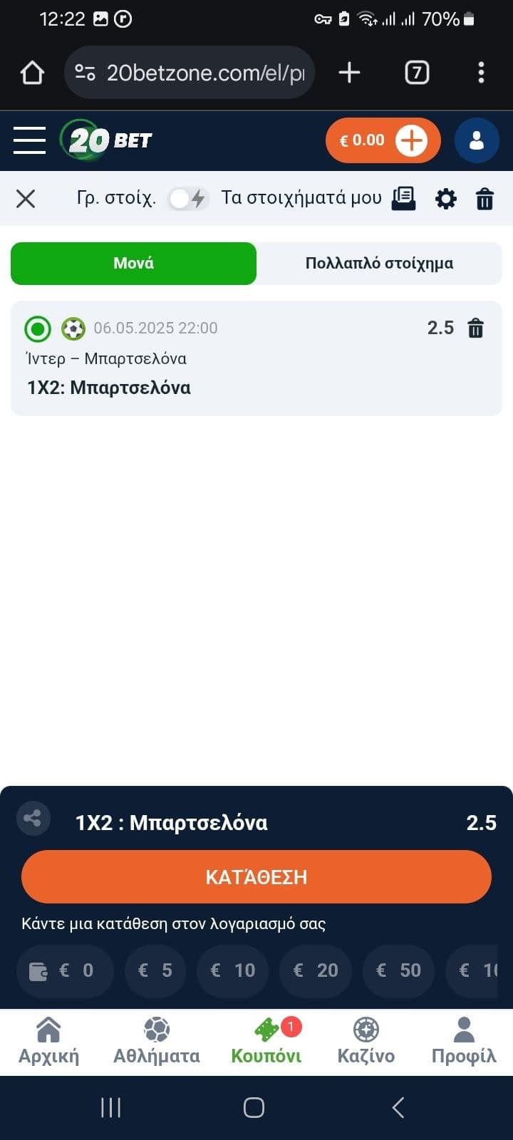 Τα αθλητικά στοιχήματα στην 20Bet είναι μια γρήγορη και βολική διαδικασία. Το μόνο που χρειάζεται ο παίκτης είναι να κάνει μερικά κλικ και το στοίχημα θα τοποθετηθεί.